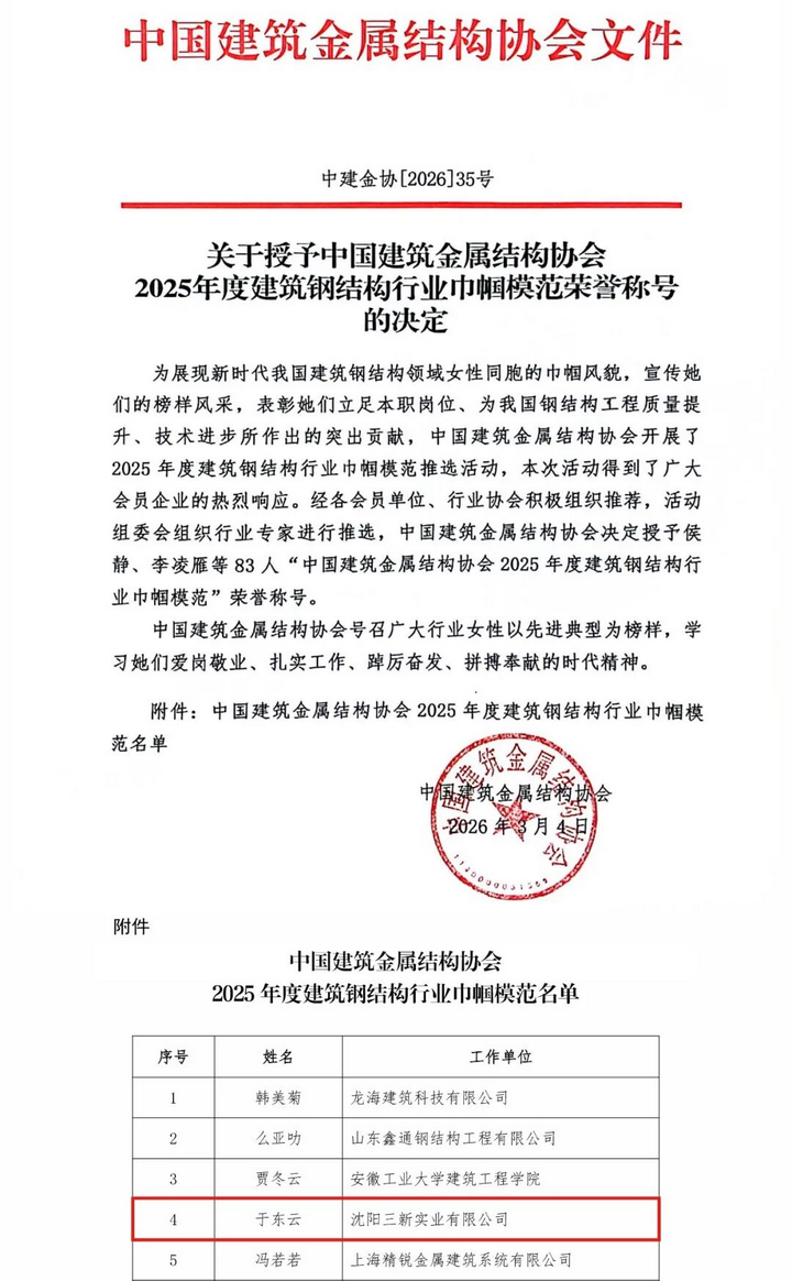 三月春风拂面,巾帼芳华绽放。近日,中国建筑金属结构协会发布中建金协[2026]35号文件,授予全国83位行业女性“2025年度建筑钢结构行业巾帼模范”荣誉称号,沈阳三新实业有限公司董事长于东云位列其中。在第116个“三八”国际劳动妇女节来临之际,这份国家级荣誉,是行业赠予她的节日厚礼,是对她深耕建筑钢结构领域多年的匠心坚守与卓越贡献的权威认可,更是对新时代女性企业家刚柔并济、勇立潮头的最美褒奖。