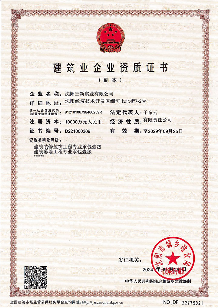 建筑装修装饰工程专业承包壹级、建筑幕墙工程专业承包壹级