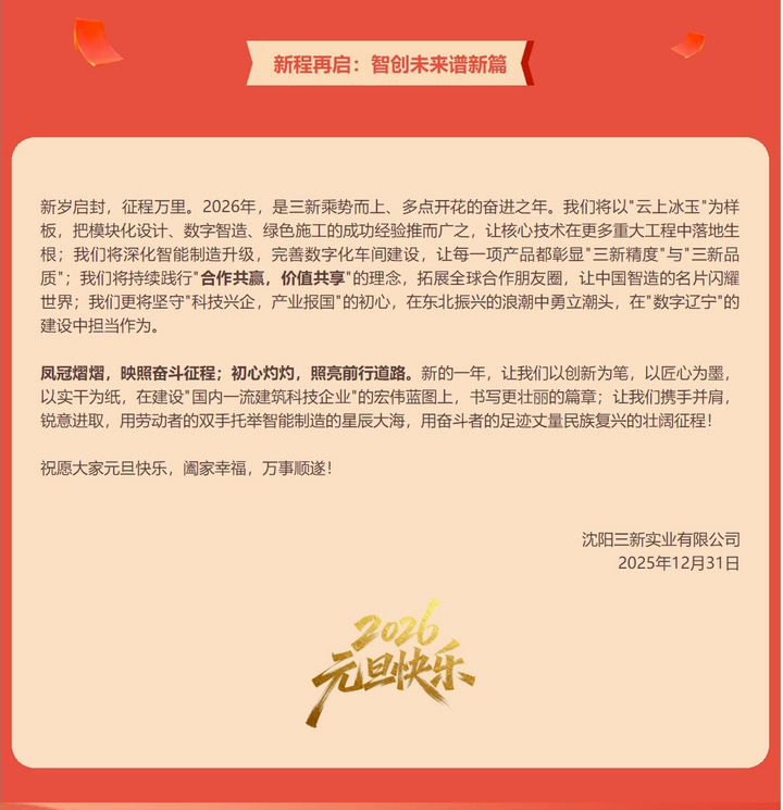 凤冠彰硕果 新质启华章——沈阳三新实业2026年元旦献词